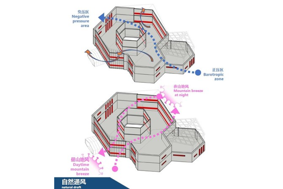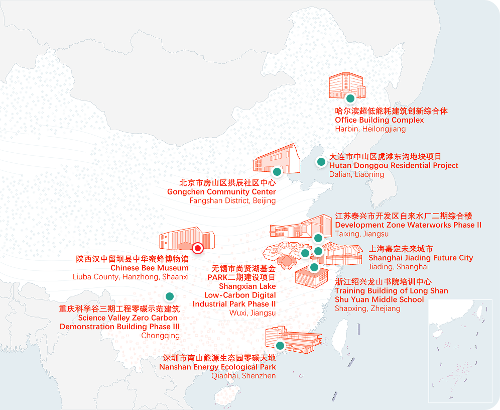 陕西留坝县中华蜜蜂博物馆是一栋位于乡村地区的零碳示范。蜂巢状钢结构最大化采光和自然通风,被动设计策略包括结构遮阳、玻璃幕墙开口和优化建筑深度,以减少太阳增益和制冷负荷。