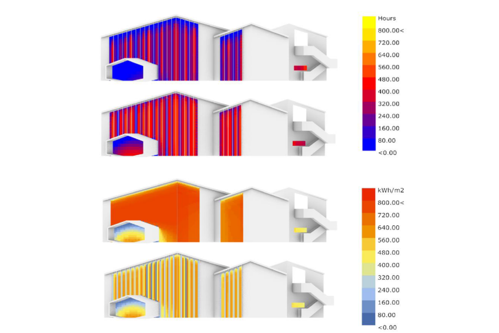 能源系统结合空气源 VRF 系统供暖制冷、带热回收的机械通风以及高效照明。112.9 kWp 光伏系统是亮点,包括屋顶 BIPV、停车区上方的 BAPV 以及集成在垂直遮阳的 CdTe 薄膜光伏。系统年发电量接近建筑年能耗的两倍,实现运营零碳排放。