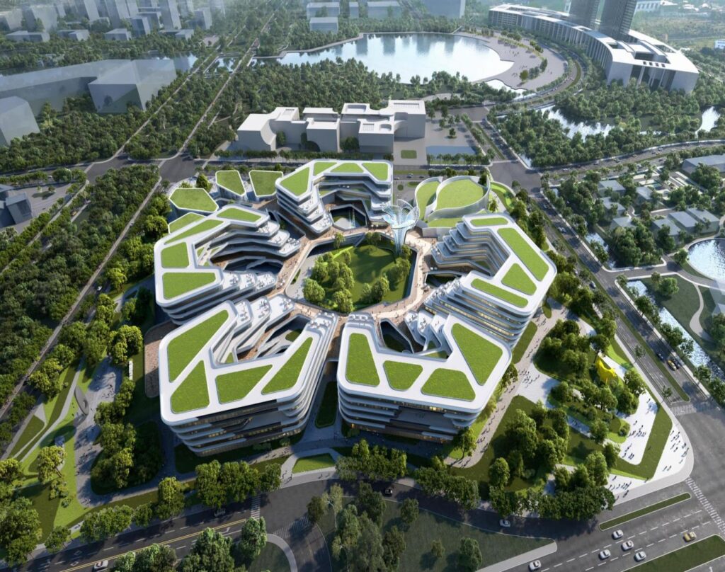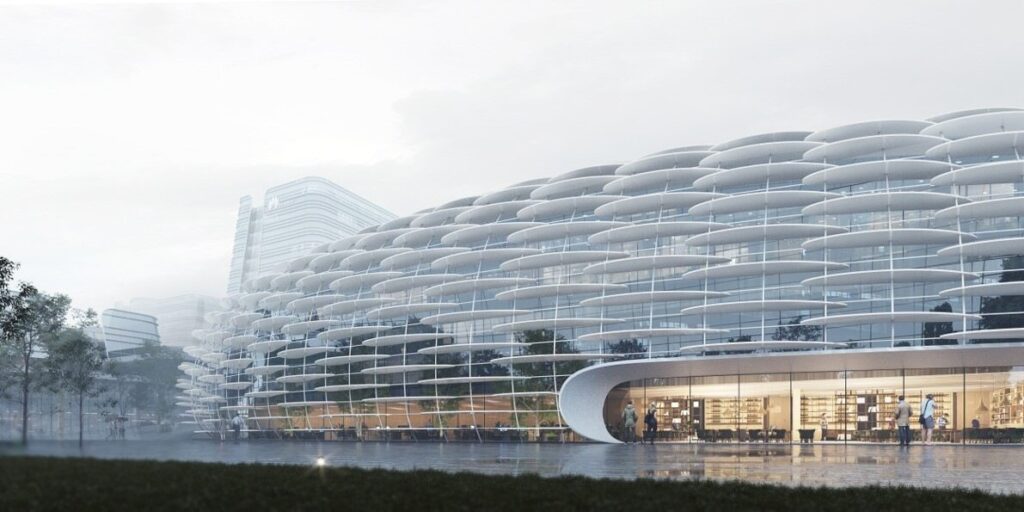 该建筑以独特造型结合全方位减排策略,涵盖微气候调节、绿色出行和运营能效,采用地源热泵进行供暖与制冷。